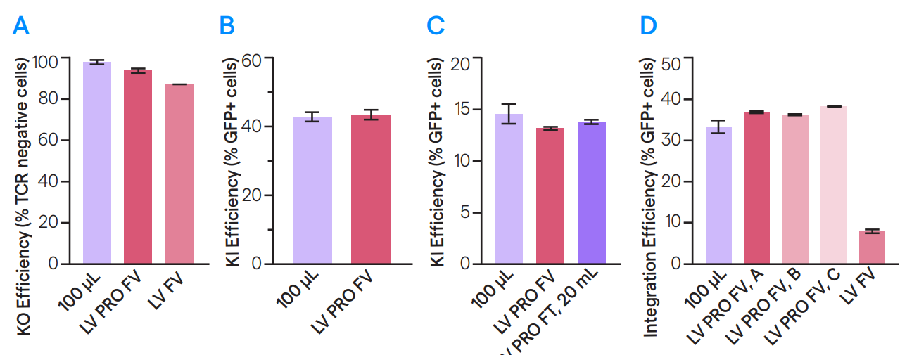 活性化T細胞における100 µL Nucleocuvette®ベッセル、固定容量2 mL Nucleocuvette®カートリッジ PRO、およびフロースルーLV Nucleocuvette®カートリッジ PROによる導入効率の再現性。(A) Cas9 RNPを用いたTRACのノックアウト(4日目、2ドナー、n=4)。(B) Cas9 RNPと3.5kb dsDNA HDRテンプレートを用いたTRAC遺伝子座へのGFPのノックイン(4日目、 1ドナー、n=8)。(C) Cas9 RNPと3.5kb dsDNA HDRテンプレートを用いたRAB11A遺伝子座へのGFPのノックイン(4日目、1ドナー、n=4)。(D)3種類のパルスを用いたpiggyBac®トランスポゼースmRNAとトランスポゾンDNAを介したGFPの統合(3日目、1ドナー、n=4)。第一世代の固定容量1mL Nucleocuvette®カートリッジ(LV FV)の性能も比較のために記載。データは代表的なドナーのものを示す。100 µL = 100 µL Nucleocuvette®ベッセル(100 µL)、LV PRO FV = 固定容量 2 mL ®Nucleocuvette®カートリッジ PRO、LV PRO FT = フロースルー LV Nucleocuvette®カートリッジ PRO。日数はトランスフェクション後を示す。